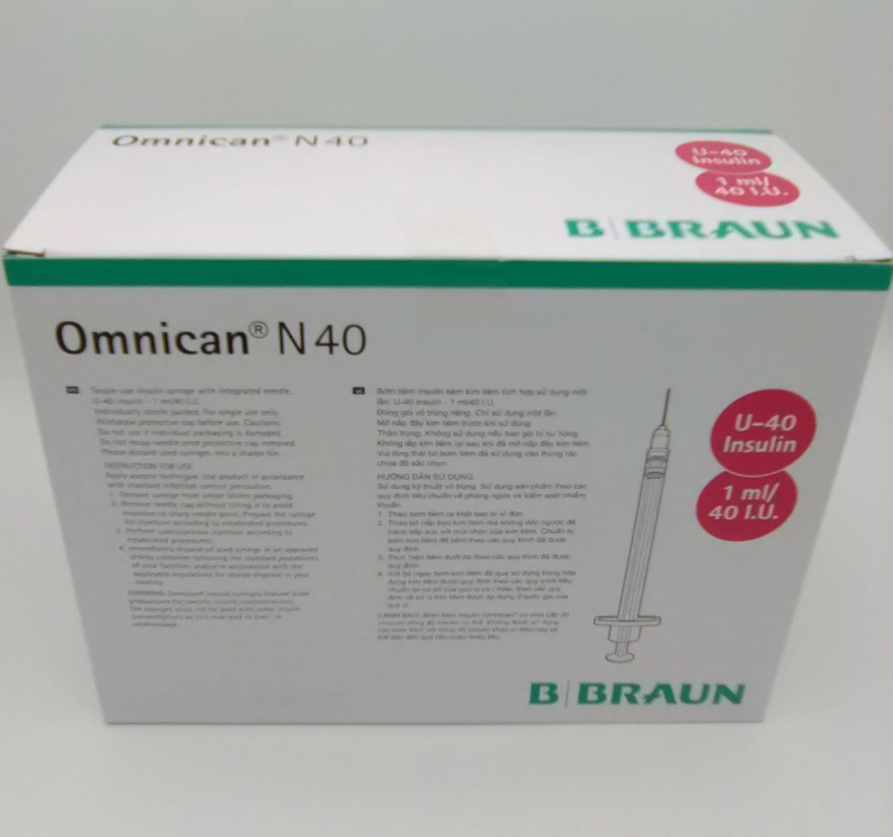 Single use insulin syringe with integrated needle with dimensions 30G x 1/2 inch needle (0.3 mm x 12 mm) and 1ml syringe at 40 I.U/ml.