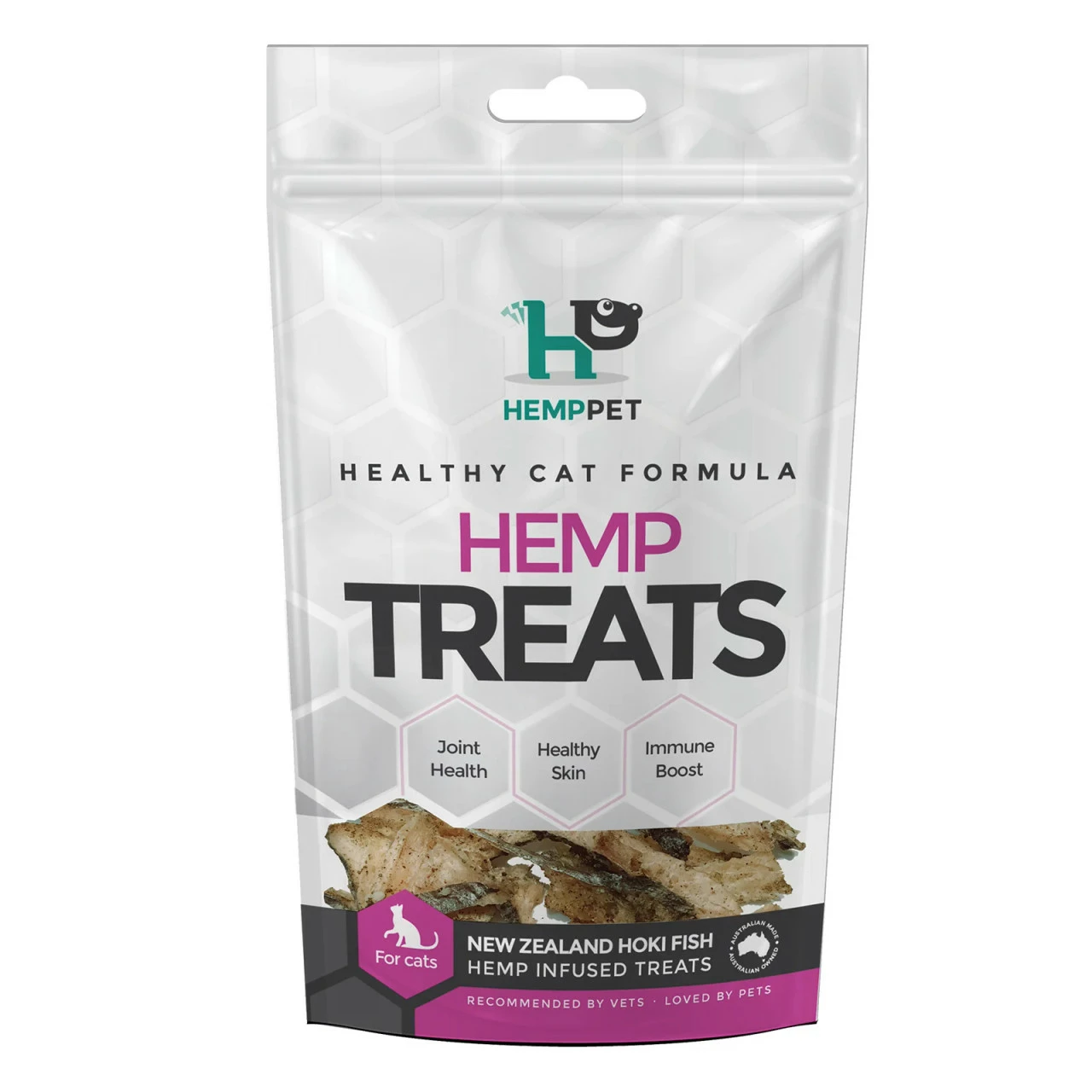 New Zealand Hoki Hemp Infused Treats for Cats have an abundance of Omega 3 & 6 essential fatty acids, vitamins B12, D and E, Selenium, Niacin (B3). Rich in EPA and DHA which all contribute to normal cognitive, nerve function. DHA is essential for brain development. EPA benefits mood and behaviour. Eating Hoki fish plays a vital role in the body – promoting healthy coats and immune function, which combined with Hempseed Nectar and Hemp proteins, may also help fight inflammatory conditions such as arthritis, allergies, or infections.