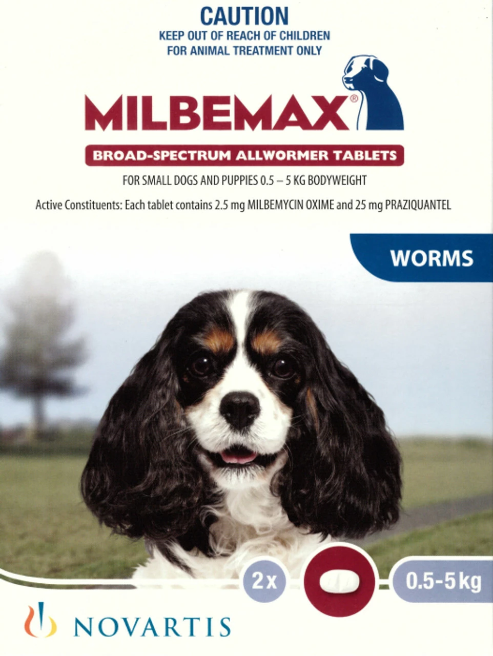 - MILBEMAX tablets for small dogs and puppies: a tablet containing 2.5 mg milbemycin oxime and 25 mg praziquantel.