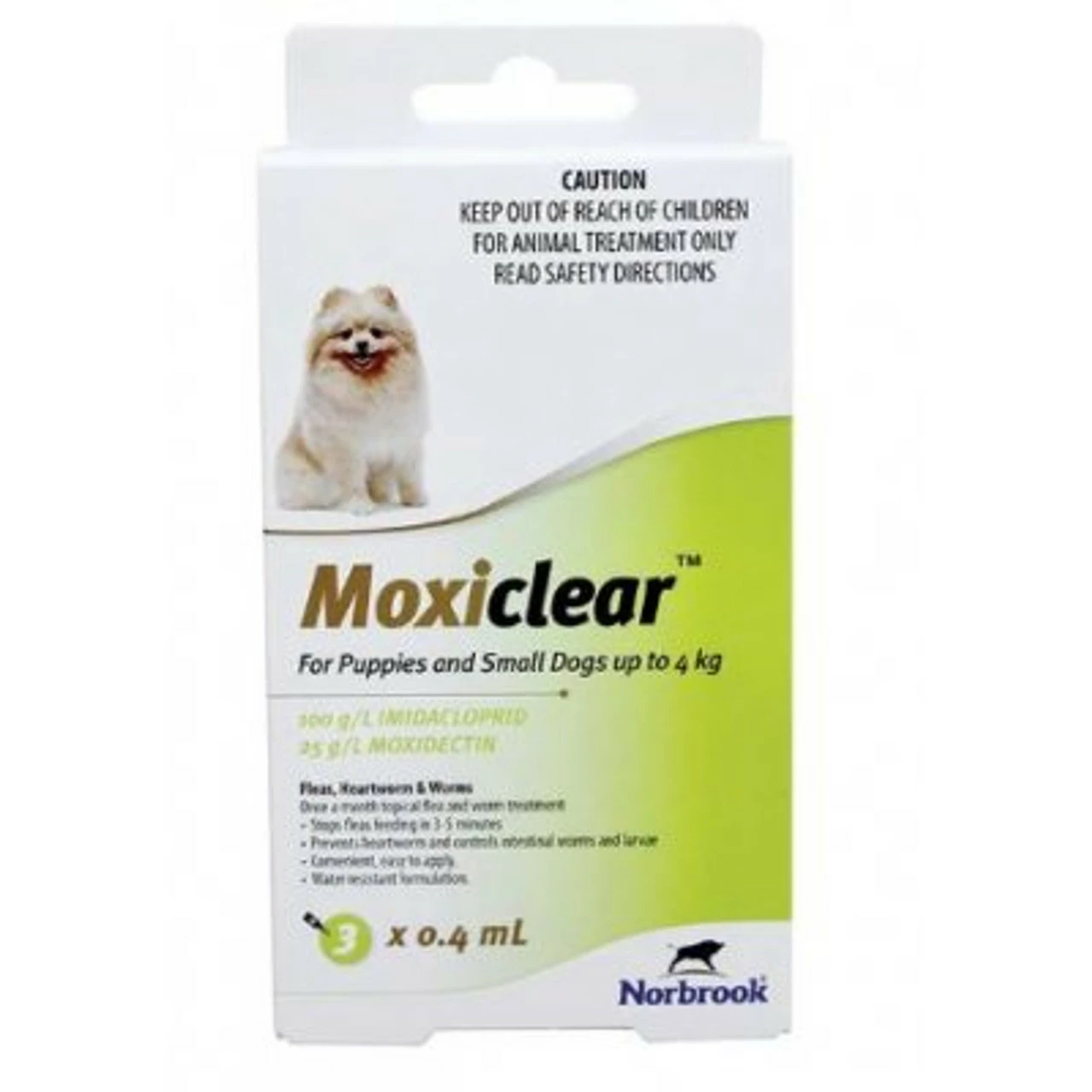 Moxiclear is a once-a-month topical spot-on treatment for Fleas, Heartworm, Intestinal Worms, Sarcoptic Mange, Ear Mites and Lice. Water resistant formulation. Ingredients: 100g/L Imidacloprid and 25g/L Moxidectin