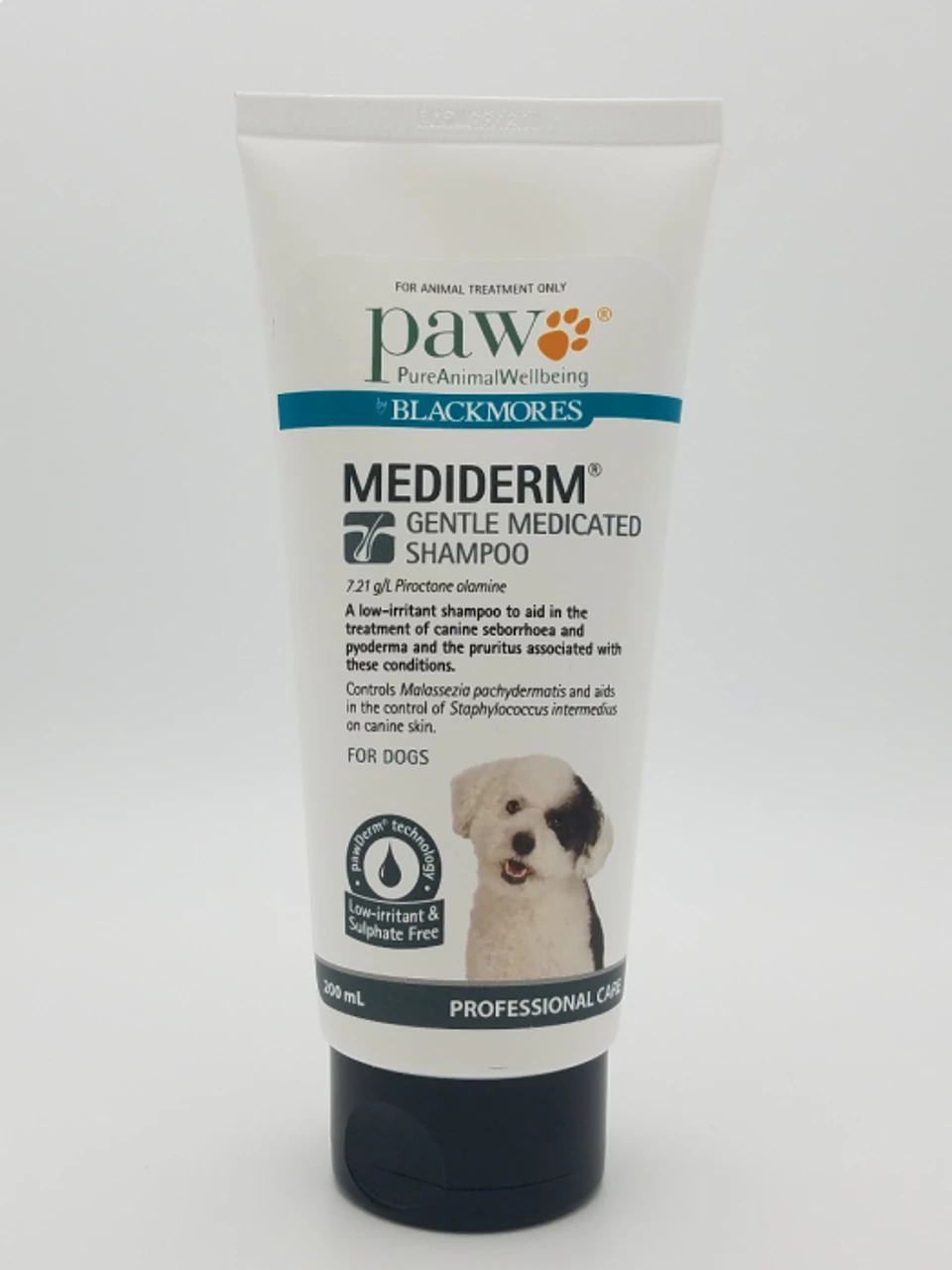 PAW MediDerm Shampoo is clinically proven to effectively treat superficial dermatitis, pyoderma and seborrhoea, control Staphylococcus intermedius and Malassezia pachydermatis, and remove scaly skin and grease.