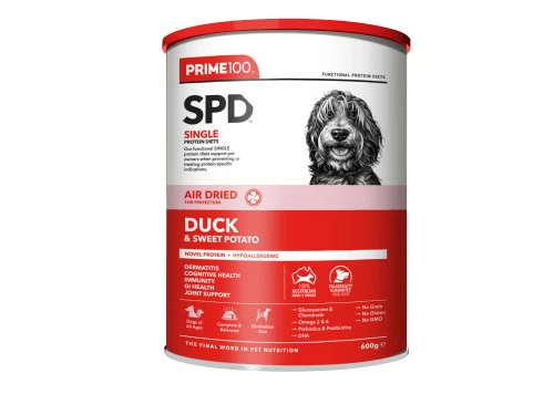 The Prime100 Single Protein Diet (SPD) Air Dried range is delicately crafted to achieve the highest quality in complete, balanced, nutritious dog food. This product comes vet recommended and suits dogs of all ages, breeds and sizes. Full of Pre and probiotics, omega 3 and 6 oils, Clucosamine, Chondroitin, DHA, and free from all GMO and Gluten products, it is the final word in pet nutrition!