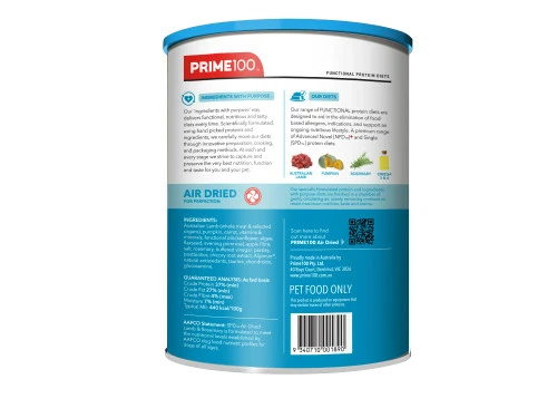 The Prime100 Single Protein Diet (SPD) Air Dried range is delicately crafted to achieve the highest quality in complete, balanced, nutritious dog food. This product comes vet recommended and suits dogs of all ages, breeds and sizes. Full of Pre and probiotics, omega 3 and 6 oils, Clucosamine, Chondroitin, DHA, and free from all GMO and Gluten products, it is the final word in pet nutrition!