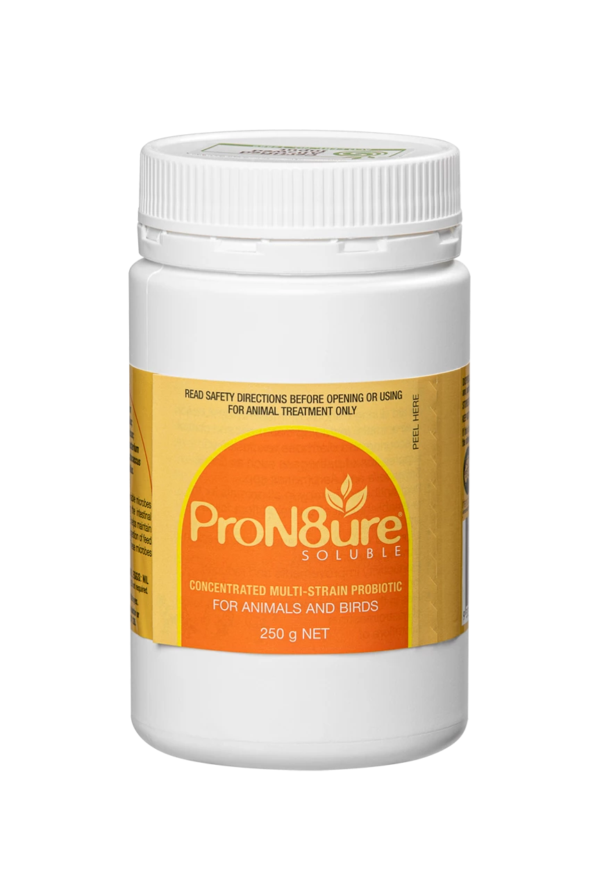 The uniqueness of Pron8ure is not just confined to its multi-strain formulation. Research and Development has produced a special “protection” to ensure the highest possible numbers of bacteria survive the journey through the hostile conditions of the crop or stomach, into the gut where they rapidly begin to work for the benefit of the animal. Pron8ure’s introduction to Australia makes it the first and to date, the only nationally registered Probiotic approved for administration to animals and birds.