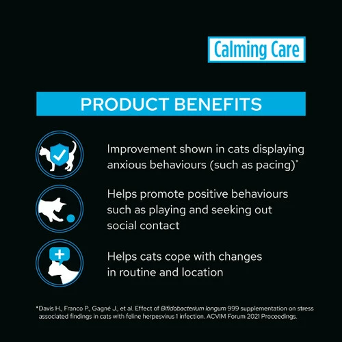 Pro Plan Calming Care for Cats is formulated with Bifidobacterium longum, a probiotic strain shown to help cats maintain calm behaviour and assist in the management of anxiety.
