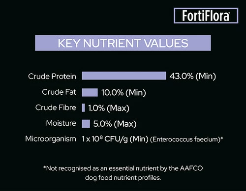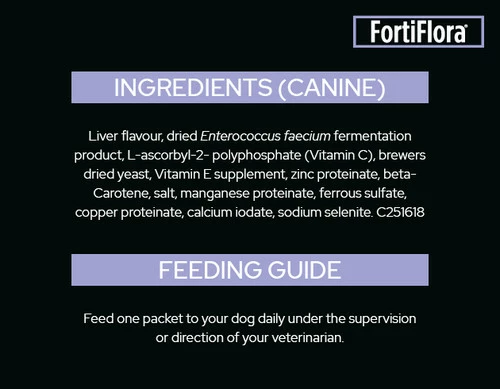 Fortiflora Canine is a potent probiotic powder containing high levels of the probiotic strain Enterococcus faecium which: